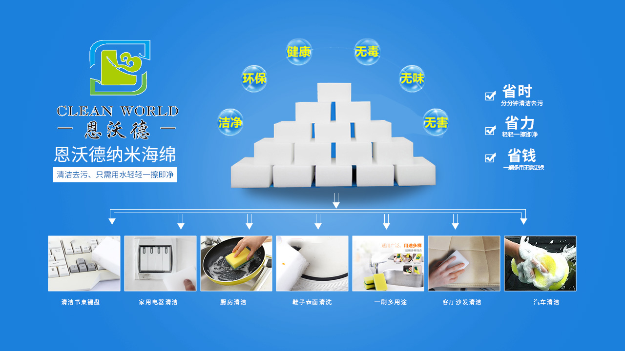 納米海綿是一種有高開孔率的三維網(wǎng)格結(jié)構(gòu)的新型泡沫塑料,采用物理去污的機理,依靠納米海綿特殊三維網(wǎng)狀結(jié)構(gòu)(每個小顆粒比頭發(fā)絲的萬分之一還小)將其浸濕后,其內(nèi)部就會形成無數(shù)個納米級毛細管開孔結(jié)構(gòu),在抹拭過程自動吸附物體表面的污漬。所以這些海綿塊只需要加一點水,就變成清潔力強的產(chǎn)品,可以擦拭頑固的污漬,也不用擔(dān)心會有刺激性化學(xué)物質(zhì)。納米海綿可以用于家中的大多數(shù)物品的表面,從油煙機到灶臺、墻壁上的畫畫印記、浴室里的水漬水垢、浴缸污垢、茶杯里的茶漬、墻壁劃痕等通常難以擦洗的表面。